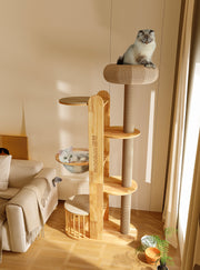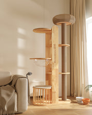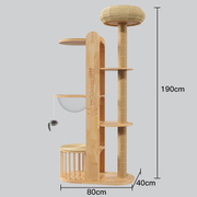 A stunning piece of feline furniture crafted from solid oak. Standing tall at 1.9 meters, this high-end cat tree boasts exceptional aesthetics that complement any home decor. Despite its impressive height, it occupies a minimal footprint, making it a practical addition to any living space. The Cloud Mist Cat Tree combines a cozy cat bed, scratching posts, jumping platforms, and a space capsule, providing an all-in-one playground for your beloved pet. Its elegant design and multifunctional features make it the ideal luxury furniture for your cat.